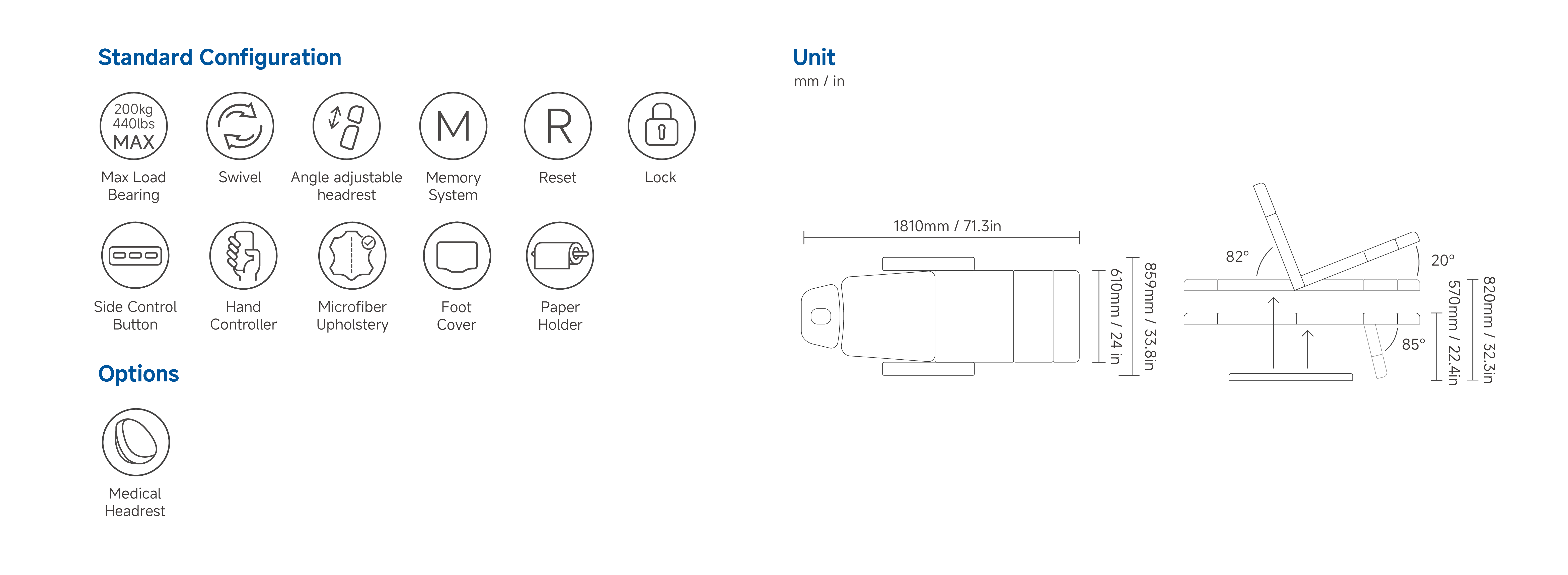 Product size(L*W*H) :1810x859x595 ∕ 980 (mm) 71.3x33.8x23.4 ∕ 38.6 (in)