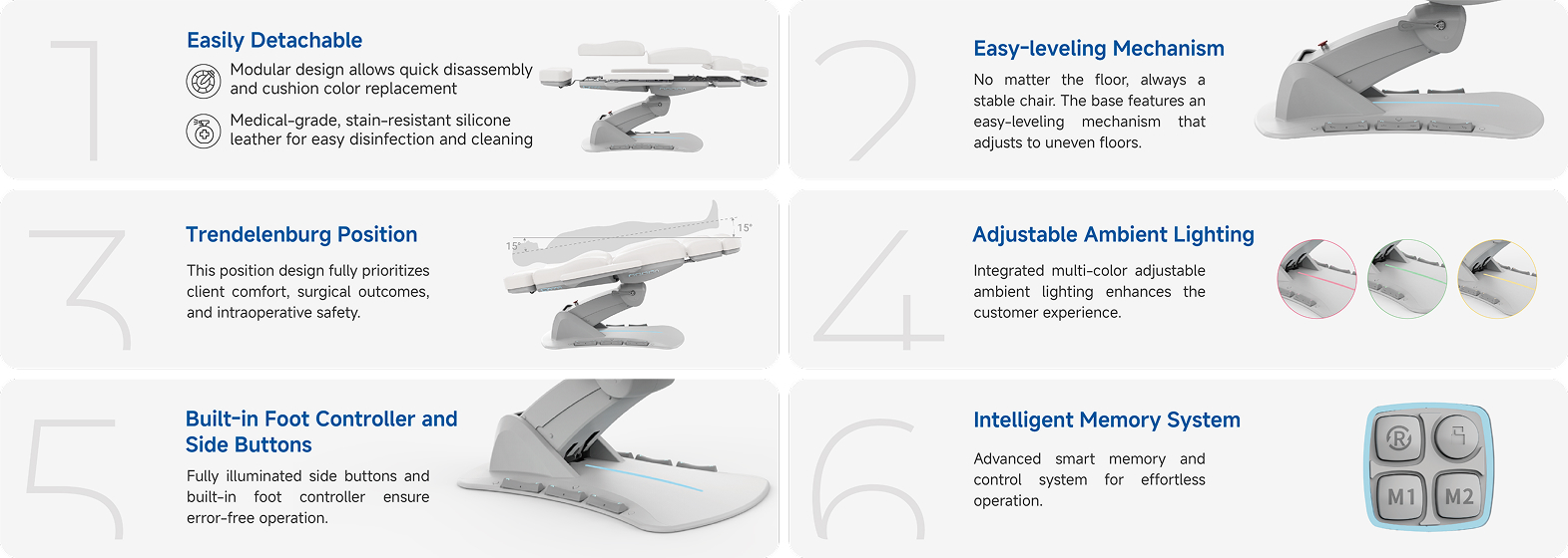 Featuring an irreplaceable ultra-thin base that blends visual lightness with unwavering stability to elevate your space and brand. Powered by 4 motors, it delivers full functionality including 240° flexible rotation, dual memory settings, one-touch reset, and built-in foot controller. The chair also comes with a detachable upholstery, ambient lighting, and adjustable headrest. Premium essentials such as silicone leather, a hand controller, and a PVC foot cover are all included as standard for a ready-to-perfect experience. Professionally certified to meet medical, FDA, and UL standards, it is the trusted solution for beauty salons and advanced aesthetic centers, perfect for dermatology and medical examinations.
