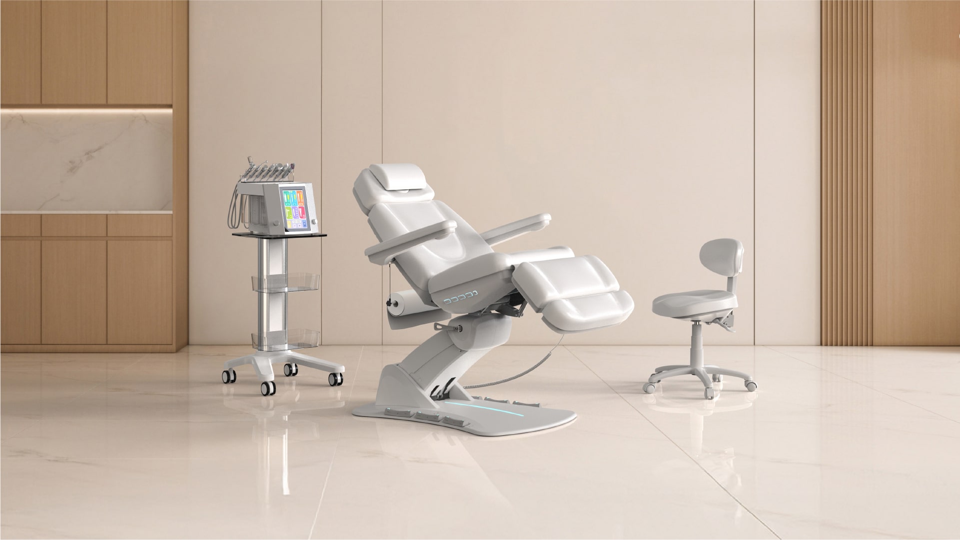 Featuring an irreplaceable ultra-thin base that blends visual lightness with unwavering stability to elevate your space and brand. Powered by 4 motors, it delivers full functionality including 240° flexible rotation, dual memory settings, one-touch reset, and built-in foot controller. The chair also comes with a detachable upholstery, ambient lighting, and adjustable headrest. Premium essentials such as silicone leather, a hand controller, and a PVC foot cover are all included as standard for a ready-to-perfect experience. Professionally certified to meet medical, FDA, and UL standards, it is the trusted solution for beauty salons and advanced aesthetic centers, perfect for dermatology and medical examinations.